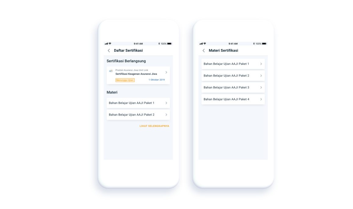 We listed the certifications and show the details. Passed agent can take action to view their certificate details. Meanwhile, agents who have not already participated in certification can download LKU (Lember Kerja Ujian) which must be taken for the test and also they can download the modules.