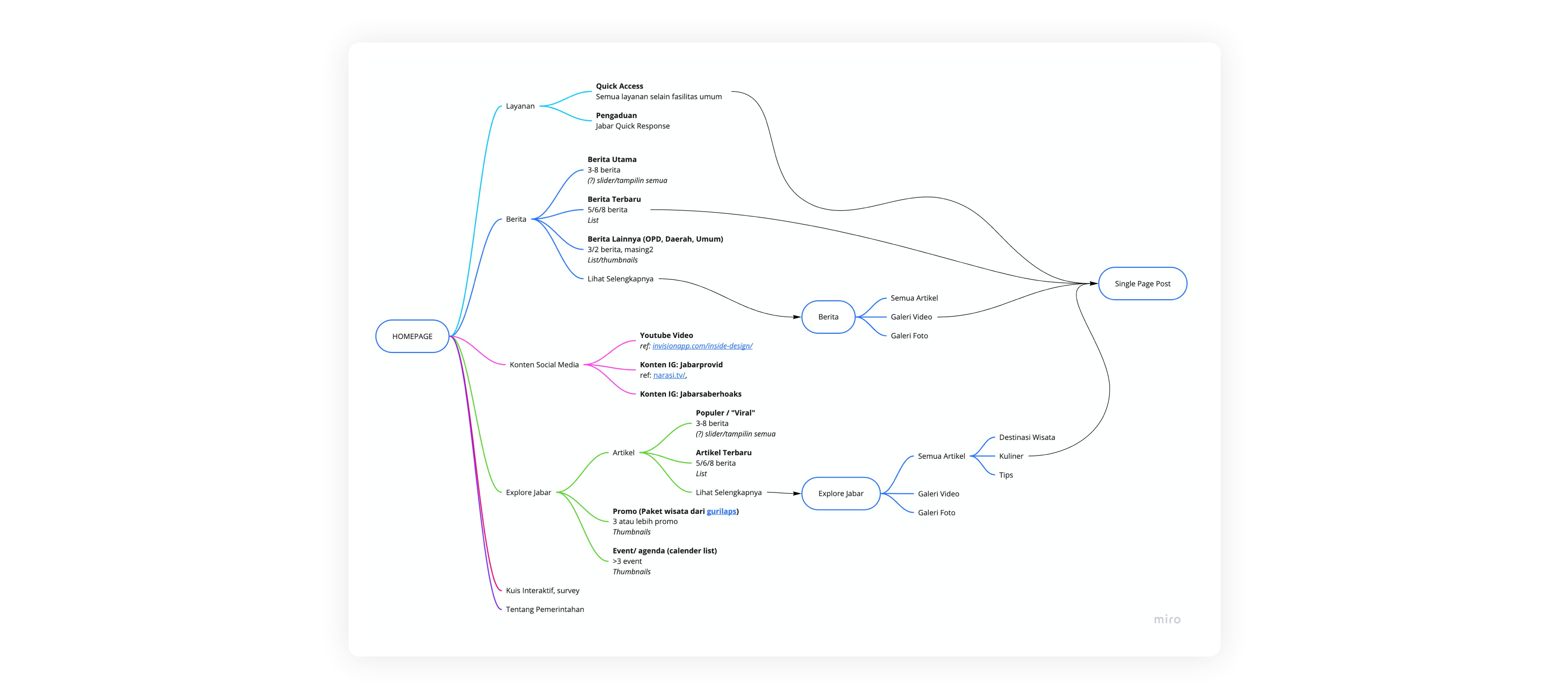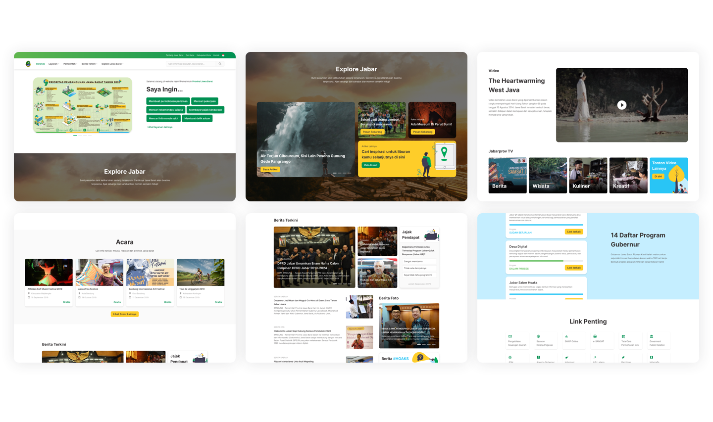 Homepage is the first page when a user lands on jabarprov.go.id. We created this page based on user needs that we found. When users land, they could see information including: public services, explore Jawa Barat, social media content, news, and government. Also we improved this page to more interactive, in hope for increasing visitor sessions.