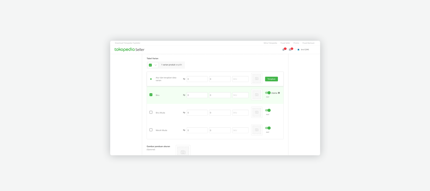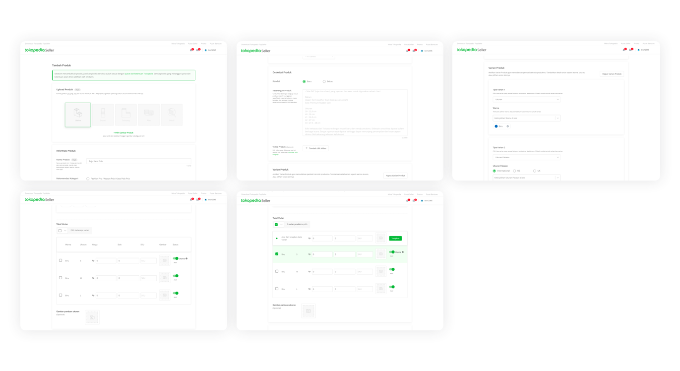 We listed all attributes related to product variants. Then we consider the impacts between the main product and variant. And finally we decided to make different fields input for product variants, which we translated it into a variant table. In addition we add a bulk feature to accommodate sellers who have many variants to make changes / manage their products.
